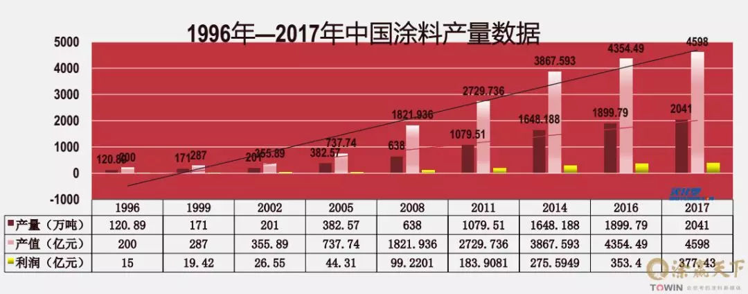 2017年,我国经济增长平稳,涂料产量整体也保持稳步增长的态势。2017年中国涂料产量达到2041万吨,首次突破2000万吨大关。