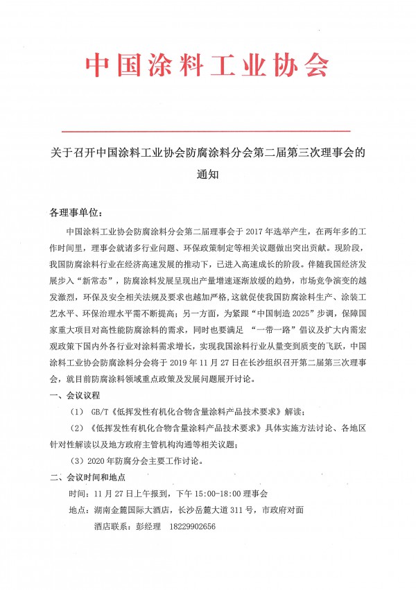 中国涂料工业协会防腐涂料分会第二届理事会于2017年选举产生,在两年多的工作时间里,理事会就诸多行业问题、环保政策制定等相关议题做出突出贡献。现阶段,我国防腐涂料行业在经济高速发展的推动下,已进入高速成长的阶段。伴随我国经济发展步入“新常态”,防腐涂料发展呈现出产量增速逐渐放缓的趋势,市场竞争演变的越发激烈,环保及安全相关法规及要求也越加严格,这就促使我国防腐涂料生产、涂装工艺水平、环保治理水平需不断提高;另一方面,为紧跟“中国制造2025”步调,保障国家重大项目对高性能防腐涂料的需求,同时也要满足“一带一路”倡议及扩大内需宏观政策下国内外各行业对涂料需求增长,实现我国涂料行业从量变到质变的飞跃,中国涂料工业协会防腐涂料分会将于2019年11月27日在长沙组织召开第二届第三次理事会,就目前防腐涂料领域重点政策及发展问题展开讨论。